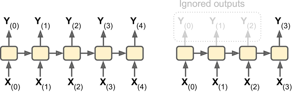 b. Alternatively, you could feed the network a sequence of inputs, and ignore all outputs except for the last one (see the top-right network). In other words, this is a sequence-to-vector network. For example, you could feed the network a sequence of words corresponding to a movie review, and the network would output a sentiment score (e.g., from –1 [hate] to +1 [love]).