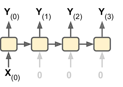 c. Conversely, you could feed the network a single input at the first time step (and zeros for all other time steps), and let it output a sequence (see the bottom-left network). This is a vector-to-sequence network. For example, the input could be an image, and the output could be a caption for that image.
