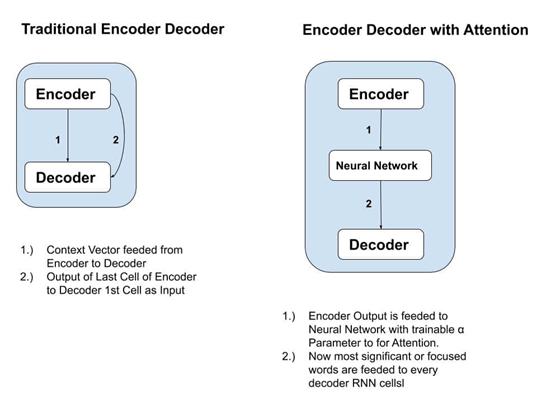 Idea to solve this issue, Researchers came up with an Idea in 2016, to add a Neural Network between Encoder and Decoder which is responsible for finding out the most significant words or we can say focused words of Input Sentence to predict target output to achieve the concept of Attention or Self-Attention