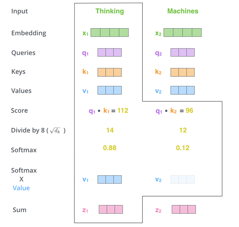 Attention(Q, K, V ) = softmax(Q *KT /√dk)V