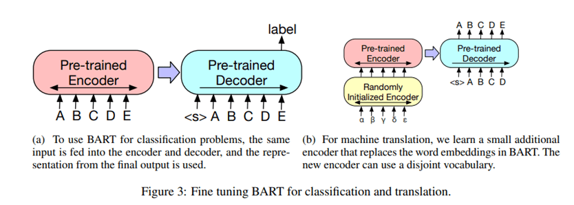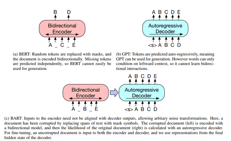 pre-trains a model combining Bidirectional and Auto-Regressive Transformers. BART is a denoising autoencoder built with a sequence-to-sequence model that is applicable to a very wide range of end tasks. Pretraining has two stages (1) text is corrupted with an arbitrary noising function, and (2) a sequence-to-sequence model is learned to reconstruct the original text.